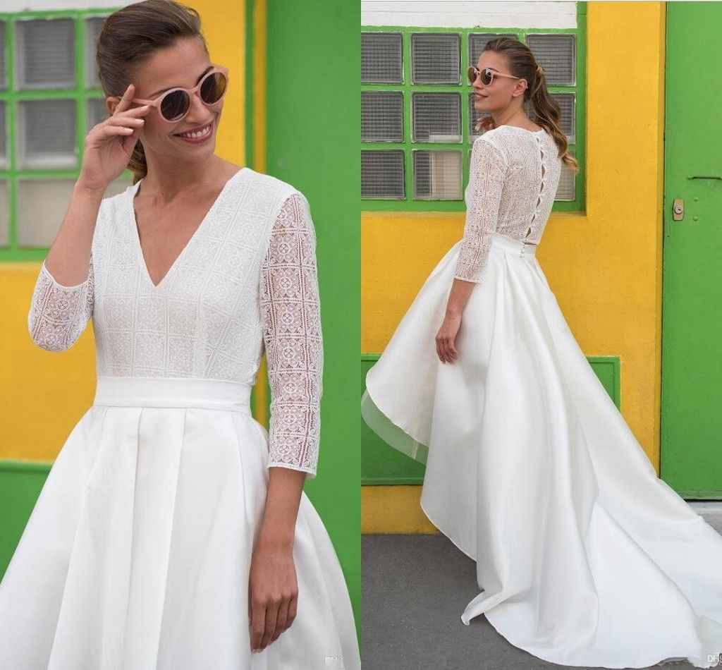 White High Low Wedding Dresses 2019 3 4 Long Sleeve V Neck Covered Button Lace Beach Country Garden Bridal Gowns Abiti Da Sposa