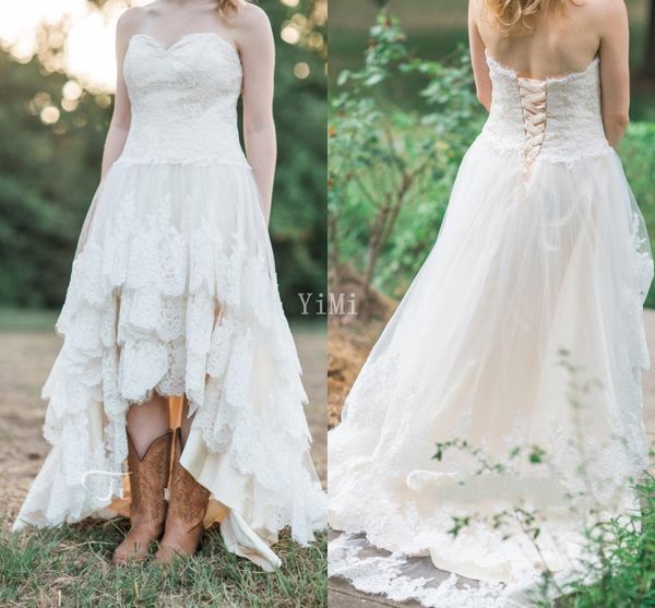 Discount 2019 Western Country A Line High Low Wedding Dresses Sweetheart Neck Tired Skirts Lace Short Bohemian Beach Bridal Gowns Cheap Plus Size Plus